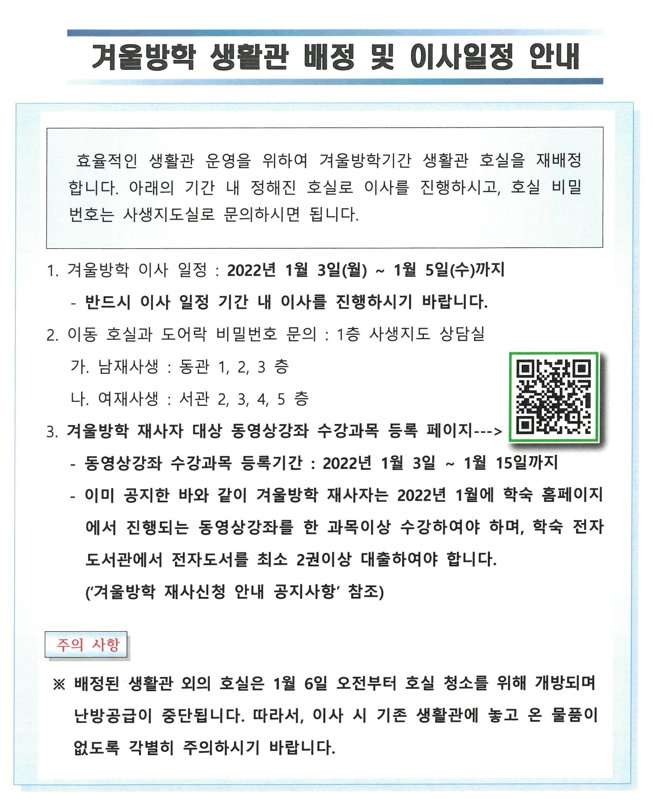 겨울방학 재사자 호실 재배정, 이사일정 및 수강강좌 등록안내
