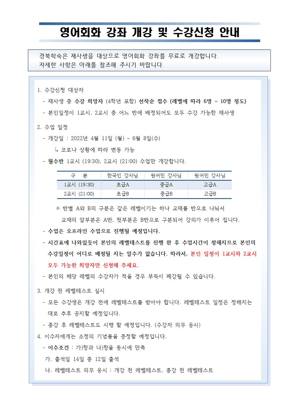 영어회화 강좌 수강신청 안내 (마감완료)