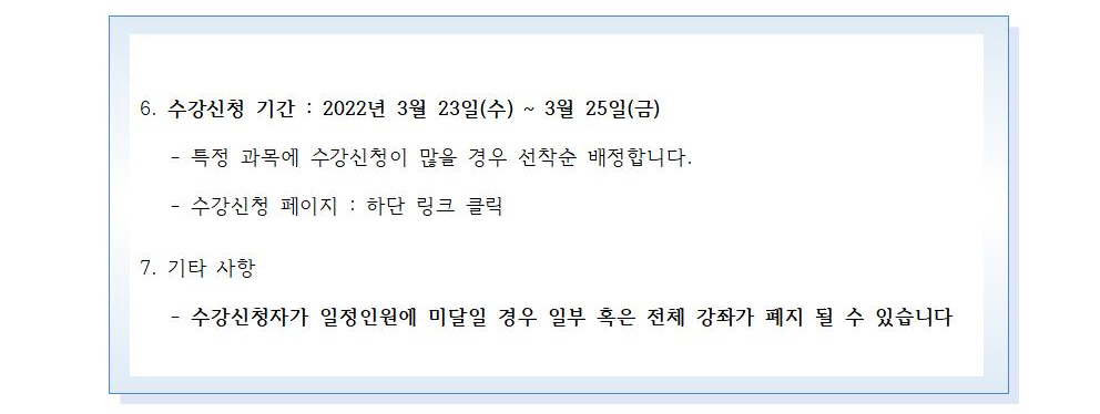 - 이전글토익 입문반 수강신청 안내 (조기마감) : 추후 수강자명단 발표 예정 22.03.22