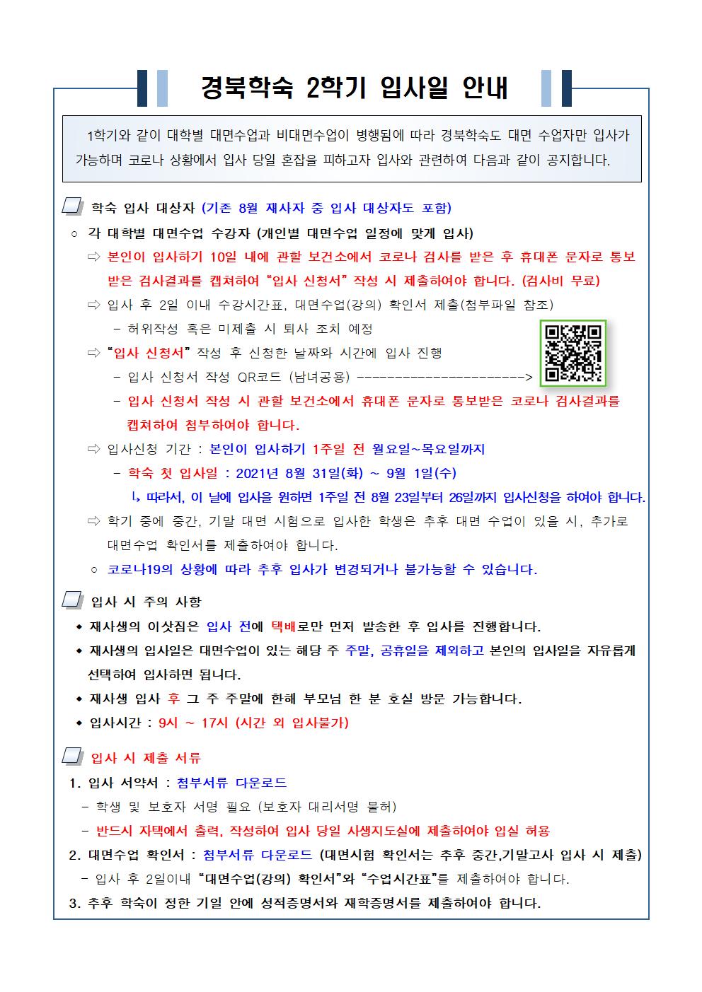 2021년 2학기 경북학숙 입사일 안내