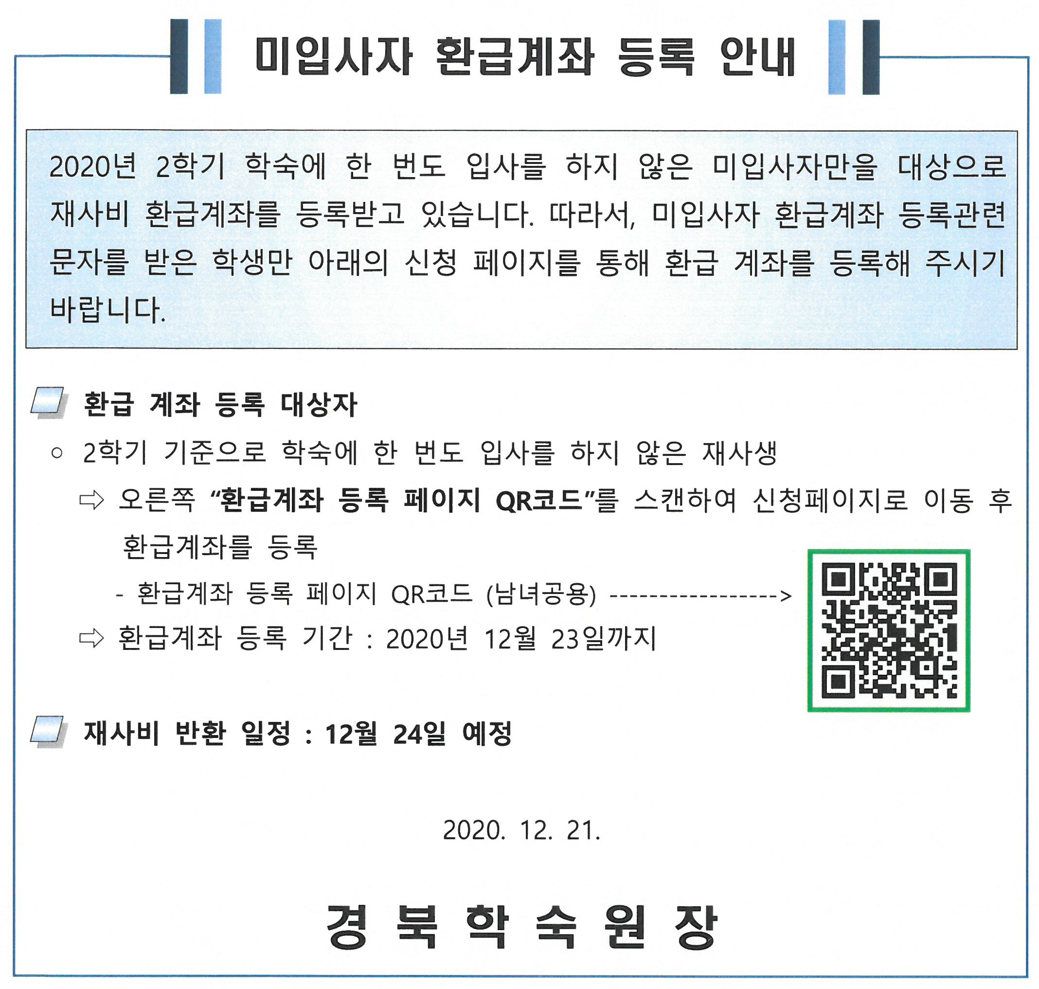 2020년 2학기 학숙 미입사자 재사비 환급계좌 등록 안내