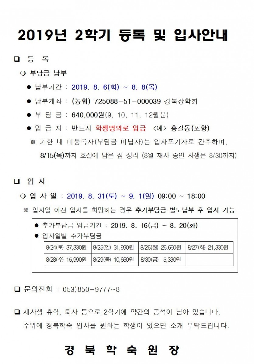 2019년 2학기 등록 및 입사안내