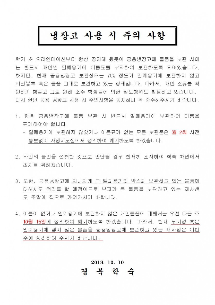 10월 15일 냉장고 정리 공지 및 냉장고 사용 시 주의 사항