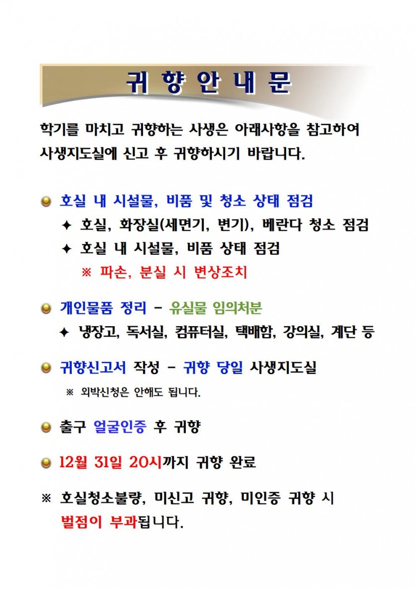 (필독) 2학기 귀향안내 페이지 정보 작성자 이주현 조회 11,222회 작성일 18-12-17 19:12 목록 본문 . 이전글겨울방학 재사 등록현황 18.12.19 다음글세탁기 교체 안내 18.12.17 댓글 0 댓글목록 등록된 댓글이 없습니다.