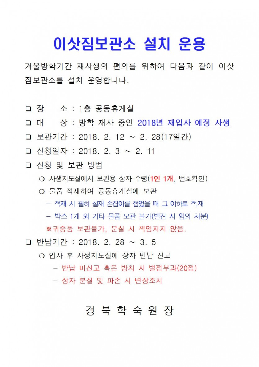 이삿짐보관소 설치 페이지 정보 작성자 이주현 조회 10,157회 작성일 18-02-03 07:50 목록 본문 . 이전글경북학숙 등록·입사 안내 18.02.07 다음글베란다 보조 난간 설치(1. 17) 18.01.16 댓글 0 댓글목록 등록된 댓글이 없습니다.