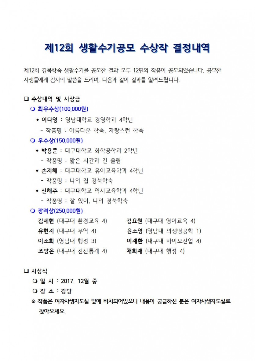 제 12회 생활수기공모 수상작 결정내역 페이지 정보 작성자 이주현 조회 9,002회 작성일 17-12-01 09:07 목록 본문 . 이전글School Bus Schedule 안내 17.12.01 다음글청결생활관 선정 결과 17.12.01 댓글 0 댓글목록 등록된 댓글이 없습니다.