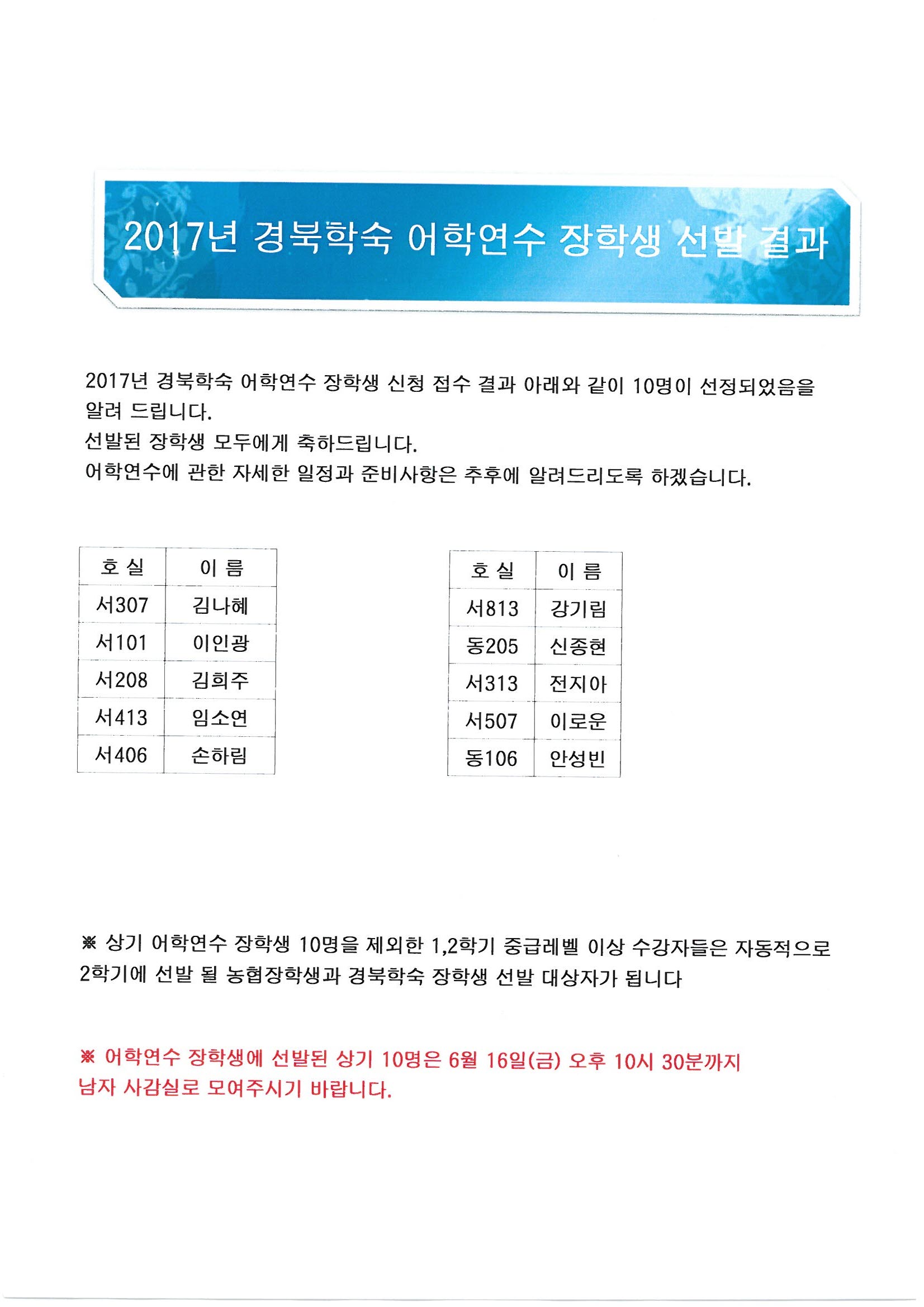 일전에 발표된 싱가폴 어학연수 장학생 선발결과가 6월 15일부터 2주 정도 로비게시판을 통해 공지가 되었으나