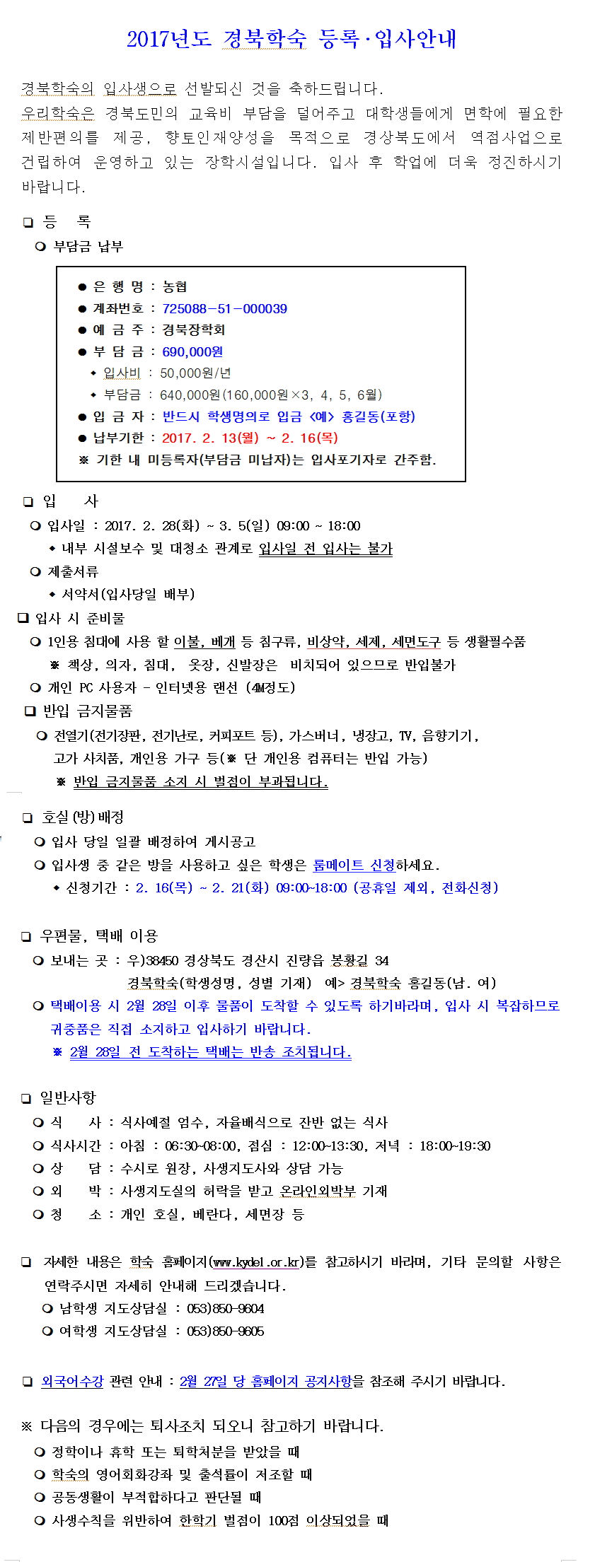 2017년도 경북학숙 등록 ‧ 입사안내 페이지 정보 작성자 이주현 조회 9,252회 작성일 17-02-07 08:40 목록 본문 . 이전글2017년 신규입사 합격자 발표 17.02.07 다음글이삿짐보관소 설치 17.02.07 댓글 0 댓글목록 등록된 댓글이 없습니다.