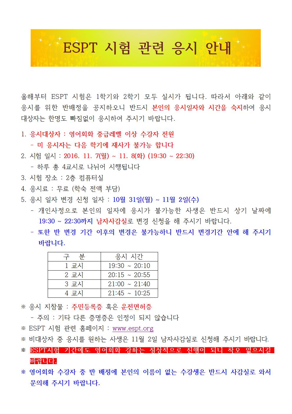 2016년 2학기 ESPT 시행 안내