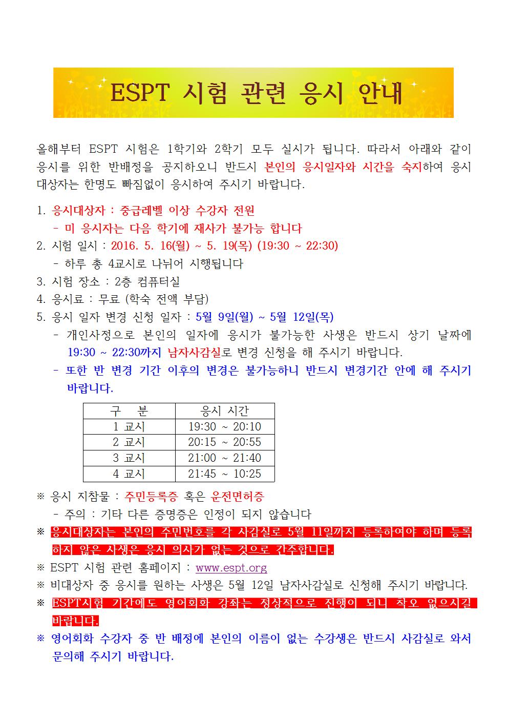 2016년 1학기 ESPT 응시 안내