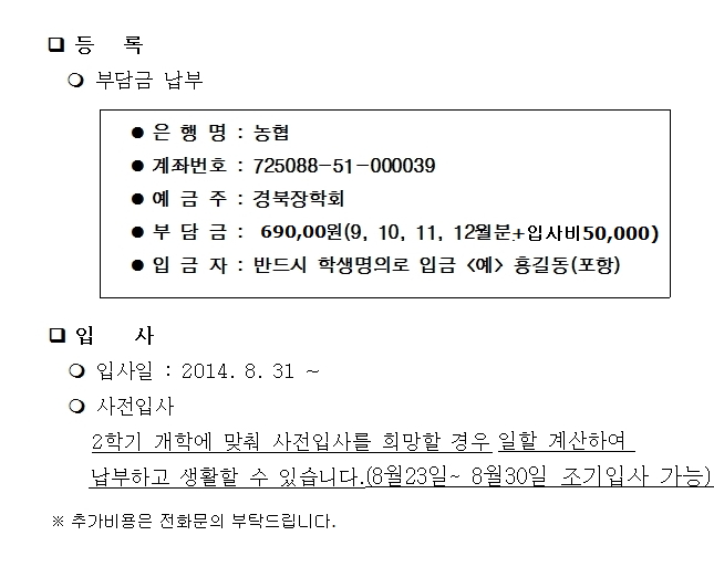 중도입사생 부담금입금계좌 안내 페이지 정보 작성자 관리자 조회 8,230회 작성일 14-08-13 12:30 목록 본문 여사생지도실 053)850-9605남사생지도실 053)850-9604 이전글방역소독실시 14.08.26 다음글2학기 등록현황 14.08.04 댓글 0 댓글목록 등록된 댓글이 없습니다.