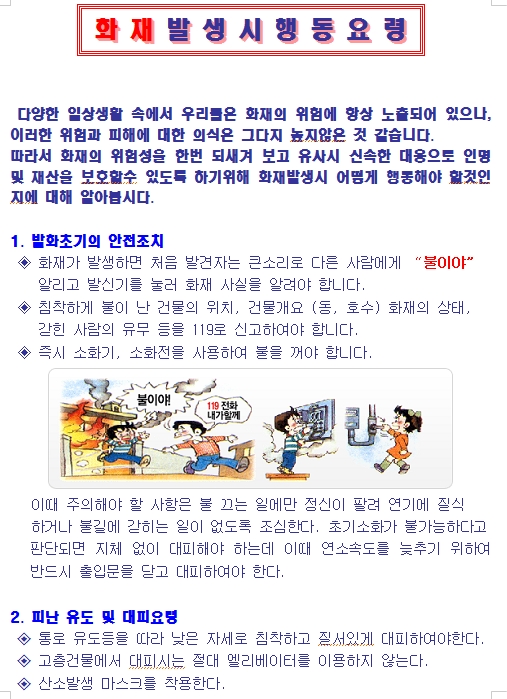 화재발생시 행동요령 페이지 정보 작성자 조인호 조회 8,079회 작성일 14-05-09 11:24 목록 본문 . 이전글생활관 청소 및 화재예방점검 14.05.13 다음글방충망 고장, 수리 신청 14.04.01 댓글 0 댓글목록 등록된 댓글이 없습니다.