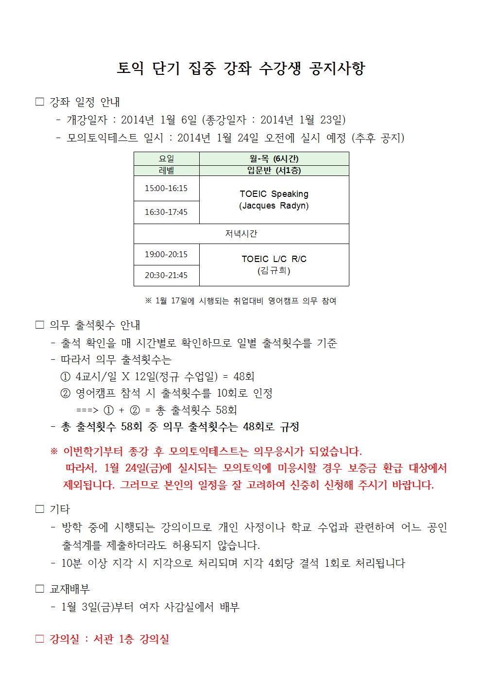 겨울방학 토익 단기 집중강좌 개강 안내