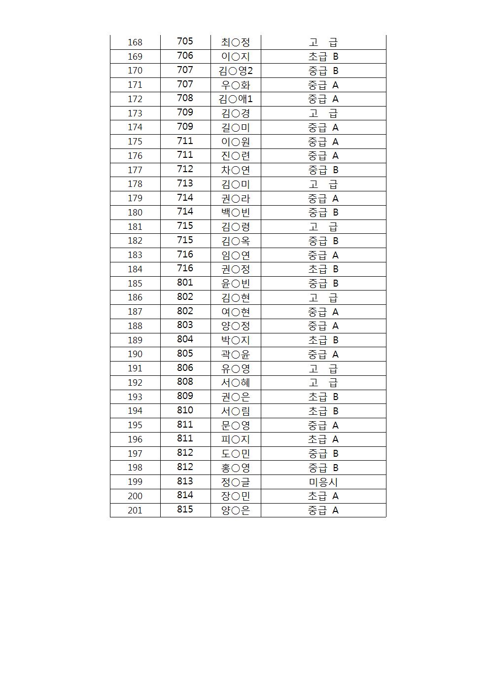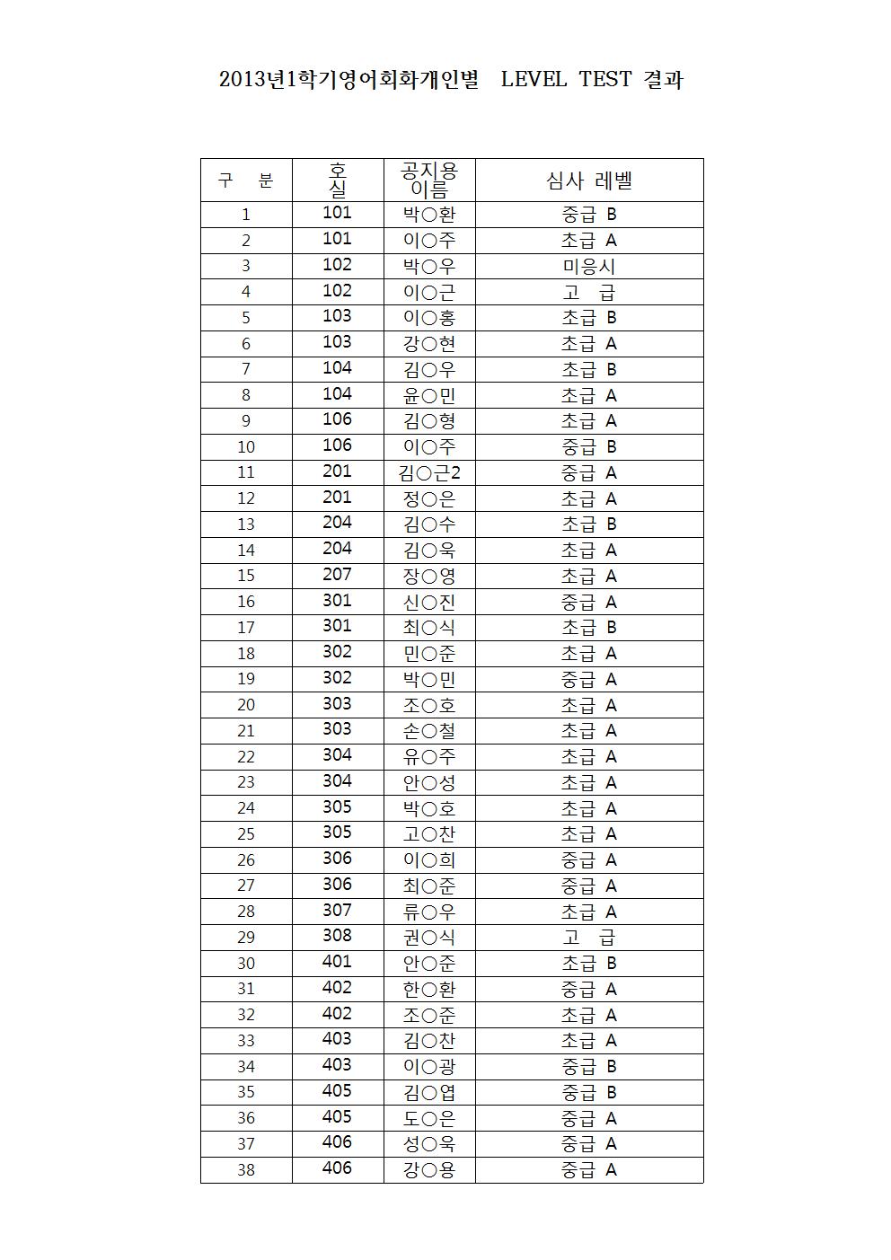 2013년 1학기 영어회화 개인별 LEVEL TEST 결과
