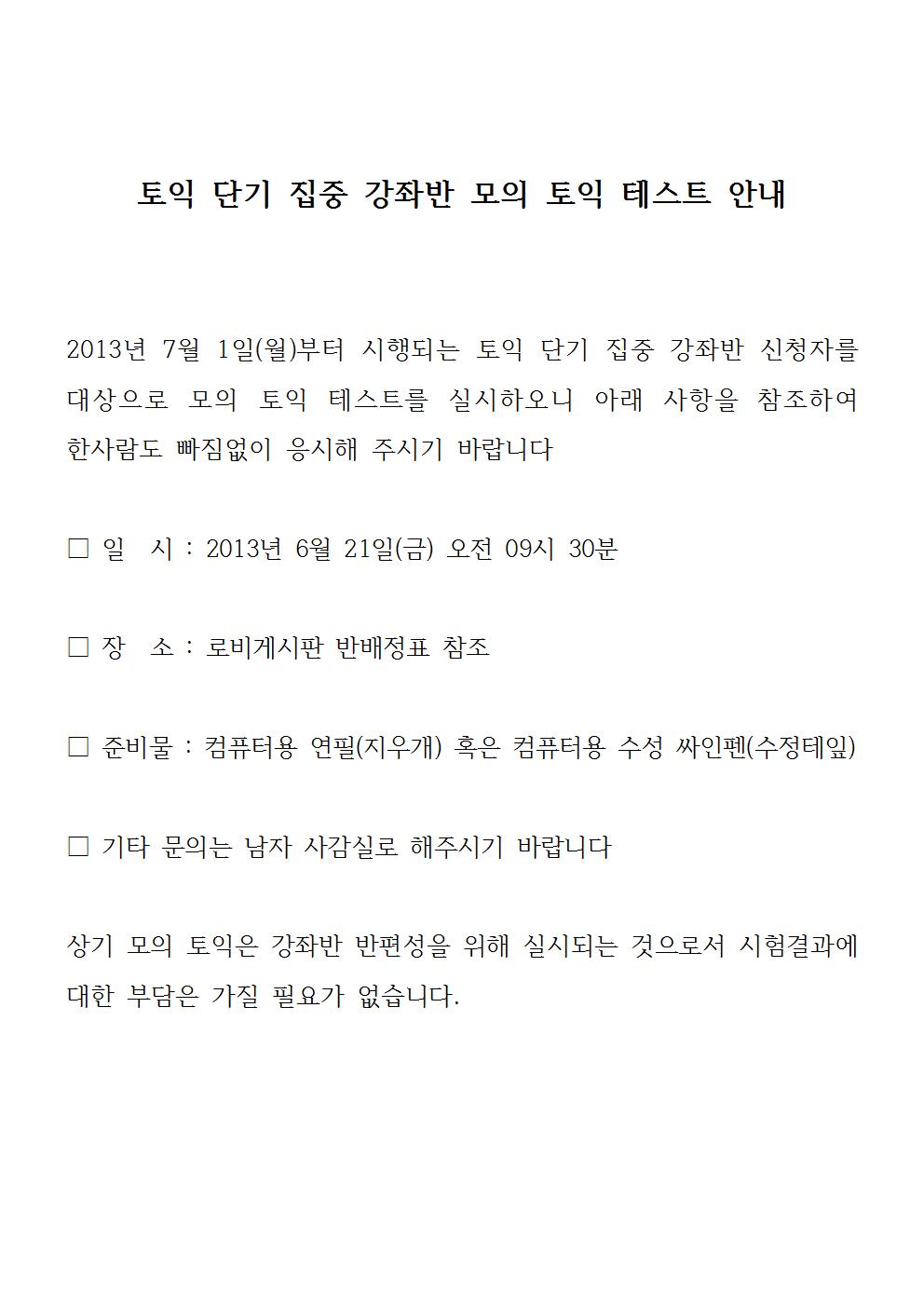 토익 단기 집중 강좌 수강자 대상 모의토익 테스트 일정 안내