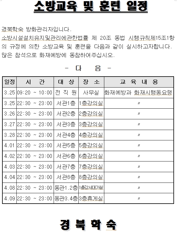 소방 교육 및 훈련 일정 페이지 정보 작성자 관리자 조회 7,653회 작성일 13-03-11 10:47 목록 본문 . 이전글3월 정기 교양강좌 13.03.12 다음글2013년 1학기 영어회화 반배정 결과 및 수강변경 관련 공지 13.03.11 댓글 0 댓글목록 등록된 댓글이 없습니다.