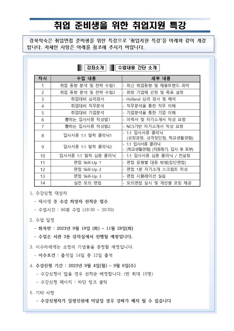 2학기 "취업준비생을 위한 취업지원 특강" 수강신청 안내