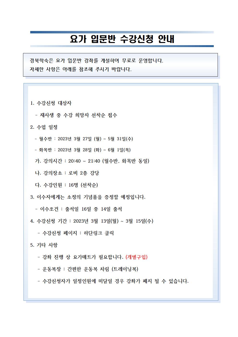 2023년 1학기 요가반 입문반 수강신청 안내