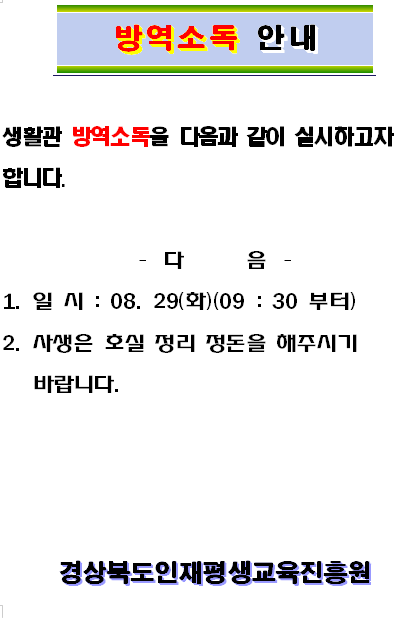 생활관 정기 방역 소독 안내 페이지 정보 작성자 조인호 조회 1,159회 작성일 23-08-28 17:22 목록 본문 . 이전글뺄래 건조기 사용법 안내 23.08.29 다음글화장실 사용 안내 23.08.28 댓글 0 댓글목록 등록된 댓글이 없습니다.
