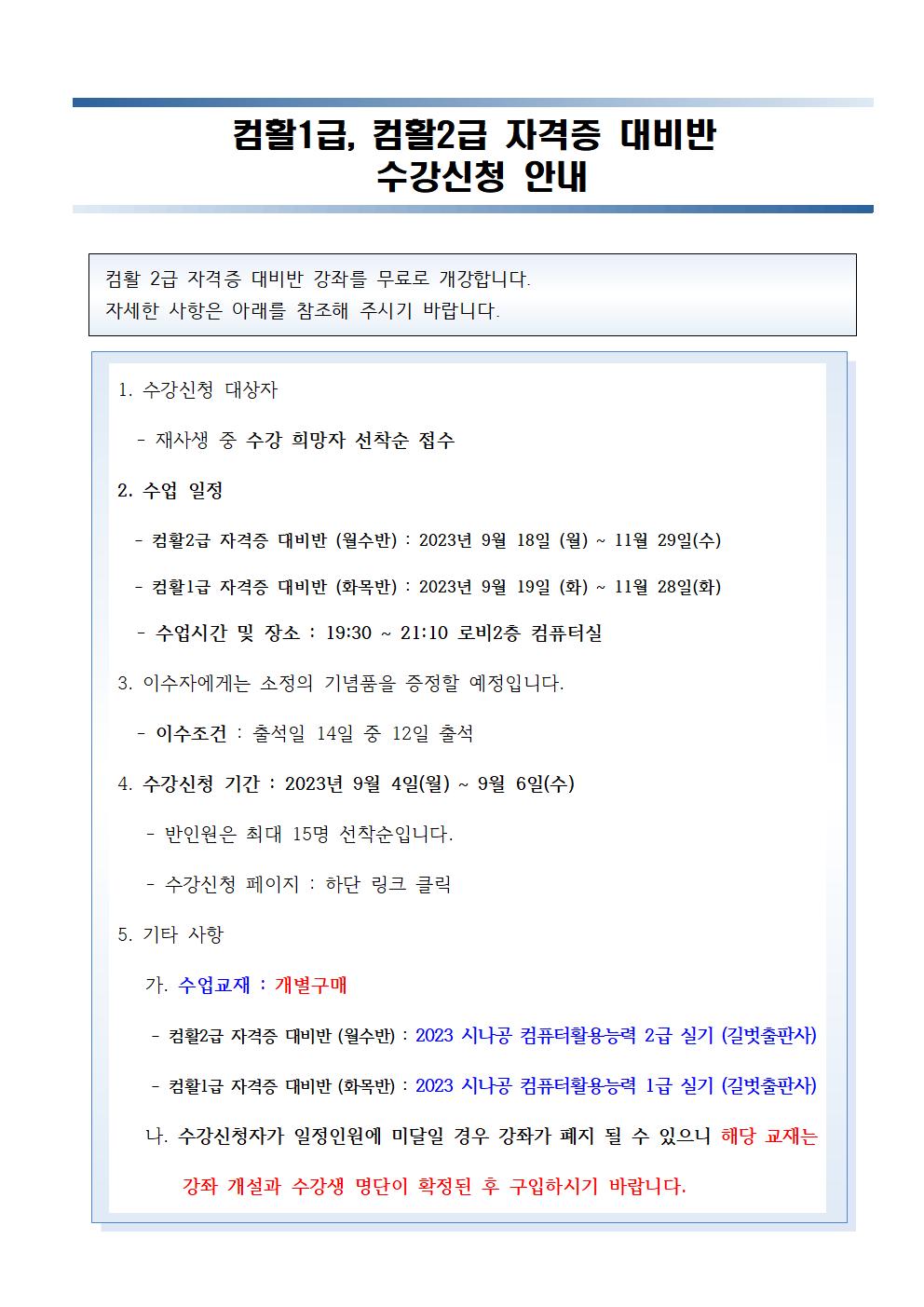 2학기 컴활1급, 컴활2급 자격증 대비반 수강신청 안내