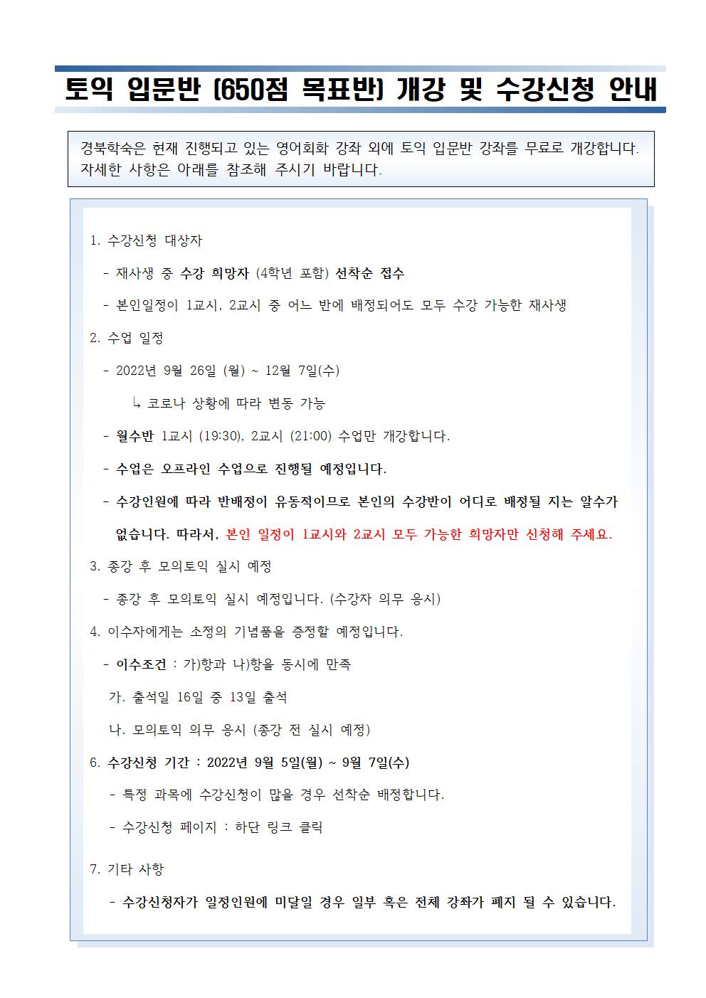 2학기 영어회화, 토익 입문반 무료특강 개강 및 수강신청 안내