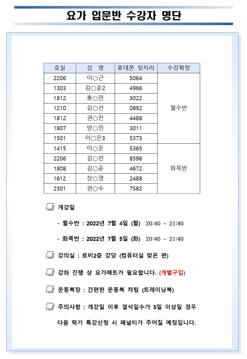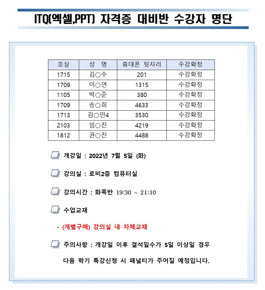 여름방학 특강 수강자 확정 명단