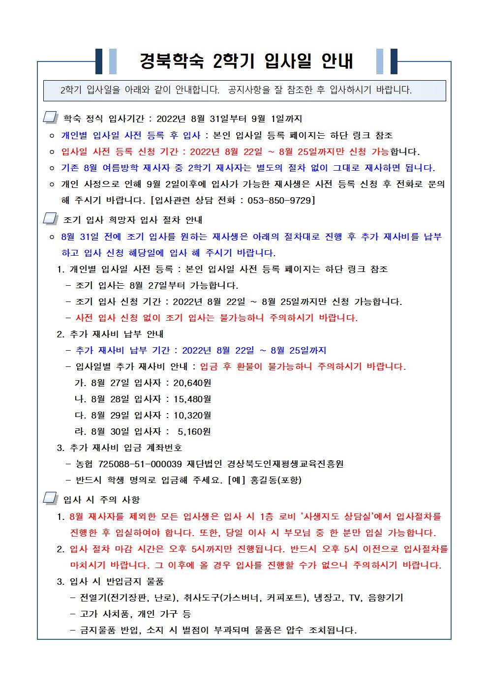 경북학숙 2학기 입사일 안내 페이지 정보 작성자 이상희 조회 3,000회 작성일 22-08-22 08:37 목록 본문 개인별 입사일 신청 페이지 (링크 클릭)https://naver.me/Gd68EChA ... 이전글생활관 방역 소독 실시 22.08.22 다음글소방시설 작동기능점검 실시 안내 22.08.08 댓글 0 댓글목록 등록된 댓글이 없습니다.