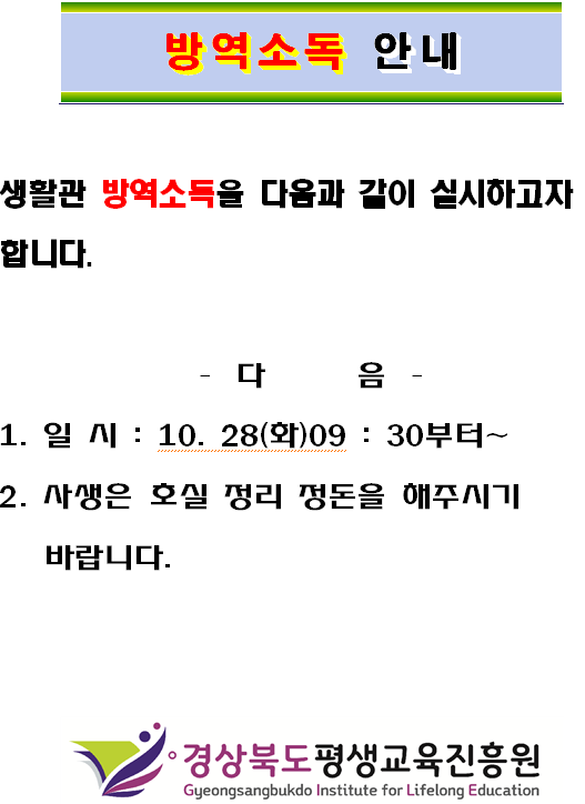10월 정기 방역 소독 안내 페이지 정보 작성자 조인호 조회 659회 작성일 25-10-24 14:55 목록 본문 . 이전글경북학숙 12월 안내 사항(퇴사 및 겨울방학 재사 관련) 25.12.08 다음글수목 방제 안내 25.10.22 댓글 0 댓글목록 등록된 댓글이 없습니다.