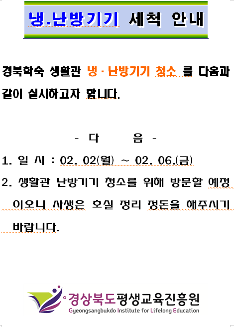 경북학숙 냉.난방기기 청소 안내 페이지 정보 작성자 조인호 조회 323회 작성일 26-02-02 10:08 목록 본문 . 이전글2026년도 경북학숙 입사생 선발결과 공고 26.02.05 다음글경북학숙 입사신청서류 등기우편 접수 현황 26.01.14 댓글 0 댓글목록 등록된 댓글이 없습니다.